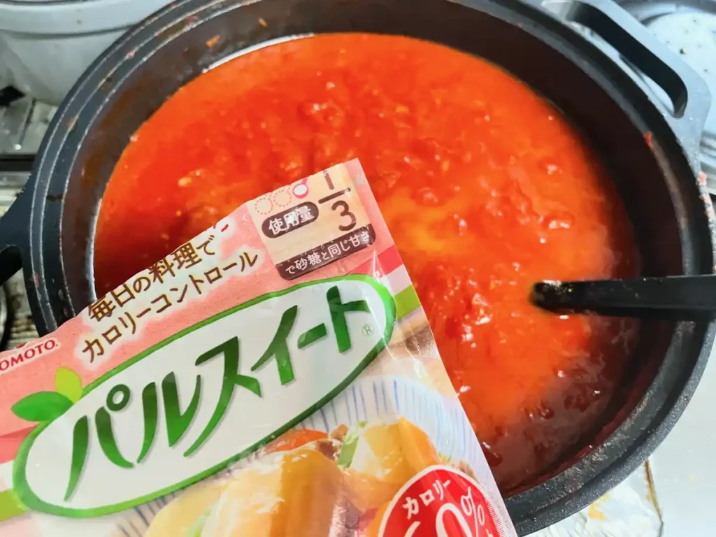 最終的に、不自然にならない程度に甘くなるよう、砂糖大さじ2相当のパルスイートを加えて調整しました。