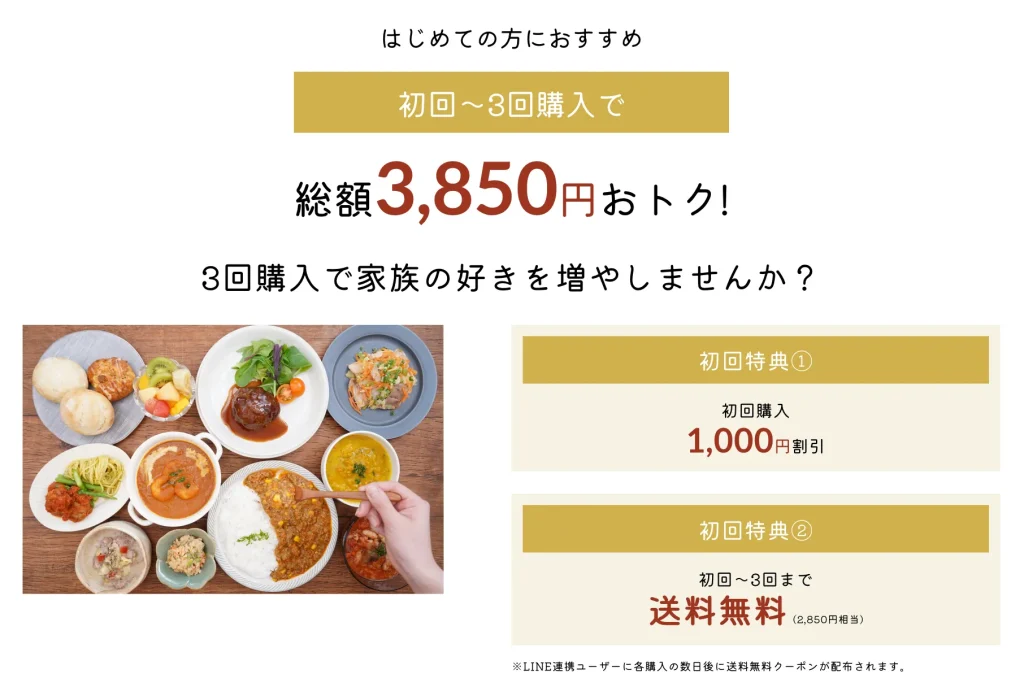 購入前後にLINEアカウントを連携することで、初回から3回目までの送料が無料になるクーポン(合計2,850円相当)が配布されます。