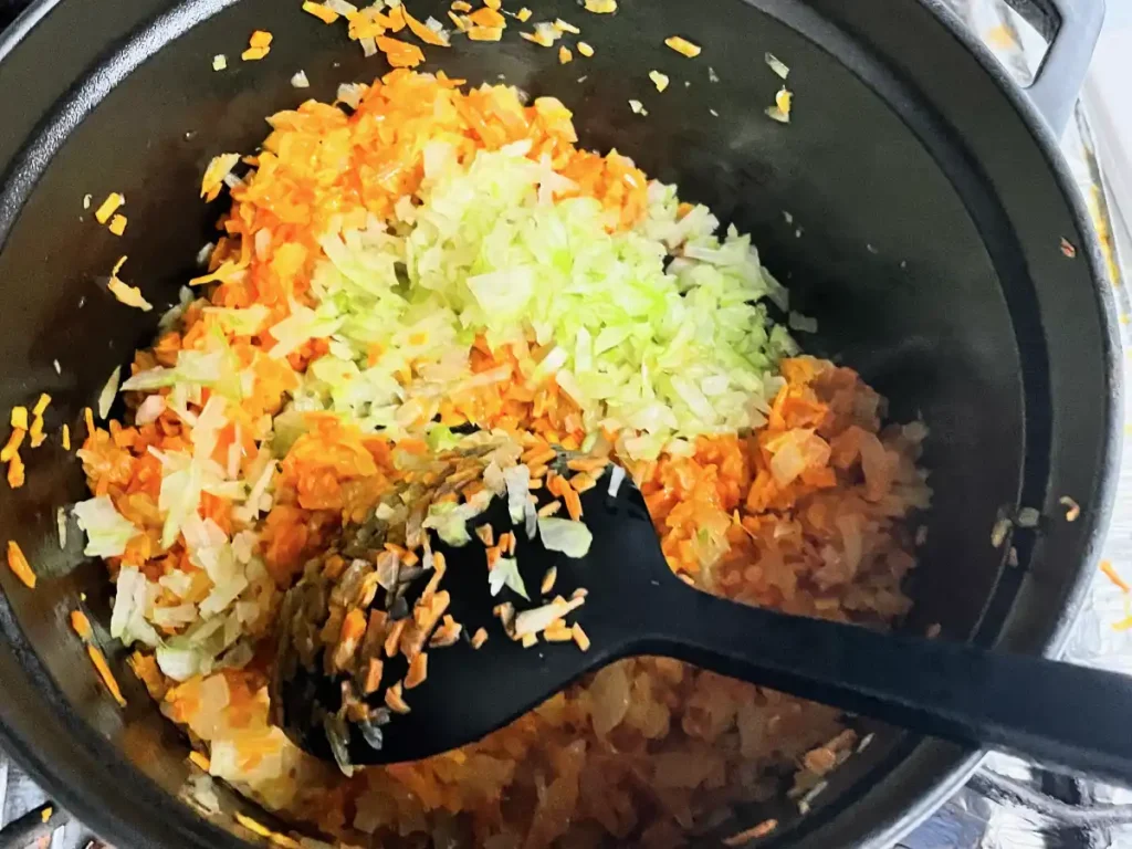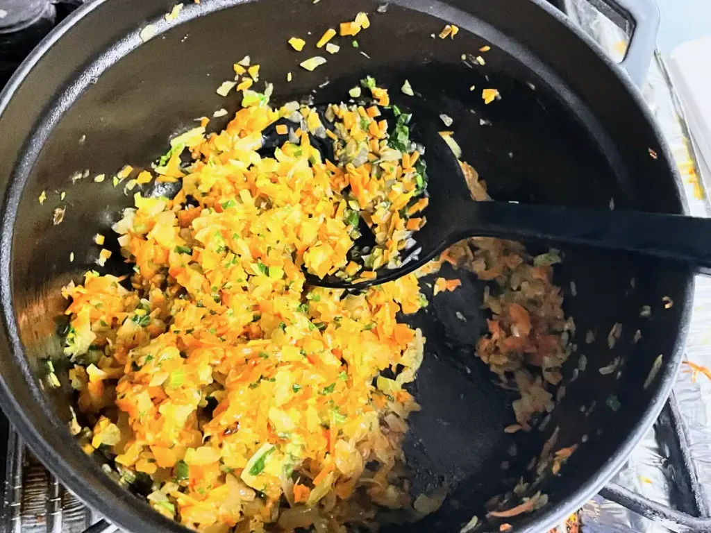 香味野菜(玉ねぎ、セロリ、にんじん)を「これでもか」というぐらい強火でしっかり炒め、甘みと旨味を引き出す。 - 野菜は包丁で刻む: