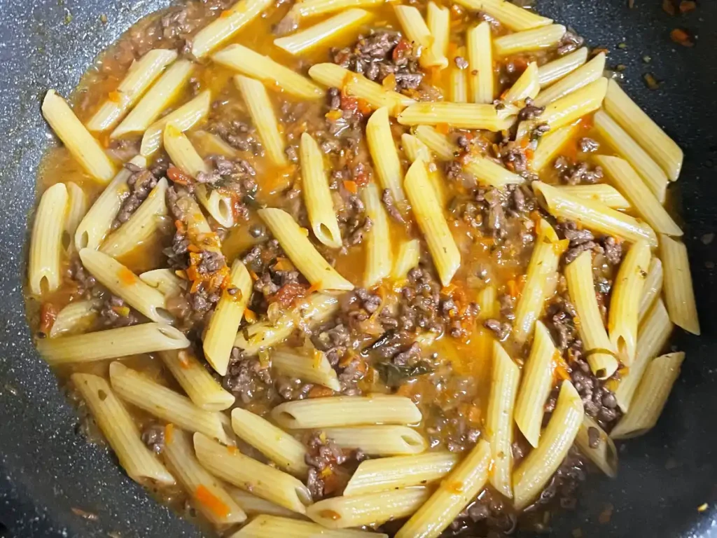 ペンネを茹で、表示より少し早めに上げます。フライパンにラグーを入れ、茹で汁で少し伸ばしたところへペンネを投入。