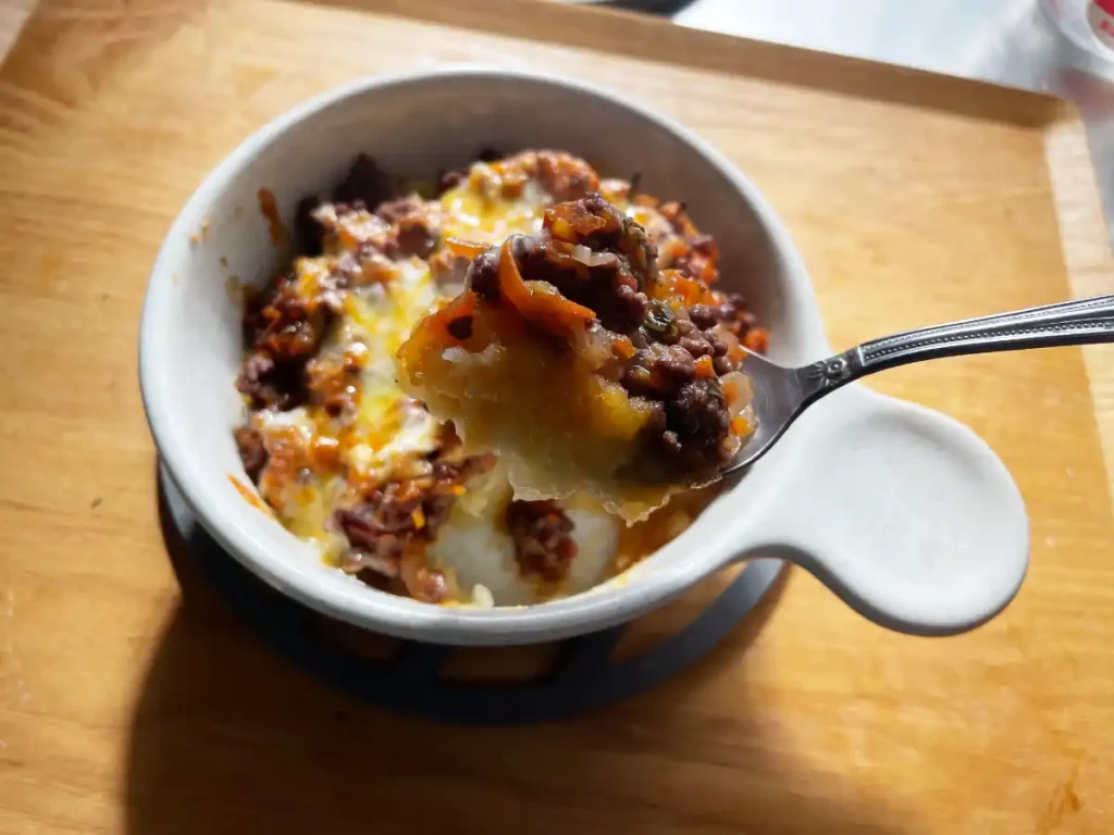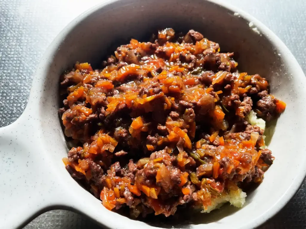 - 耐熱皿にマッシュポテトを敷き、上からラグーをかける。