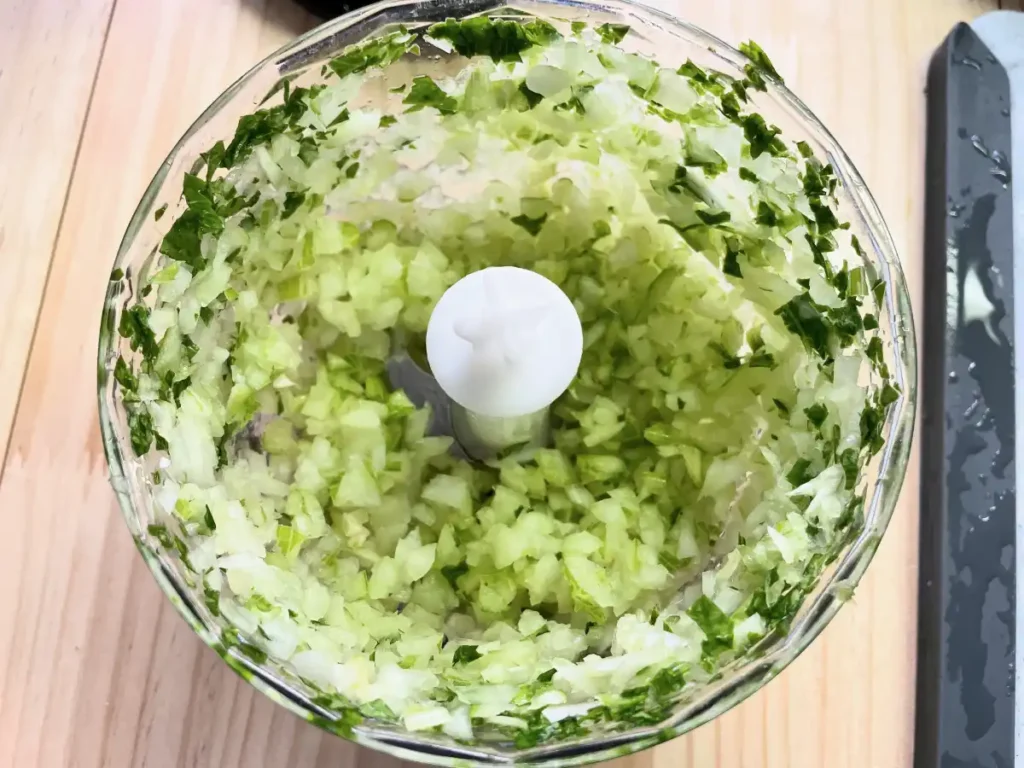 | 香味野菜はフードプロセッサーでみじん切り | 包丁で手切りするよりも圧倒的にラク。味が落ちたとは思わなかったし、むしろ野菜が細かくなることでソースとの一体感が増した。 |